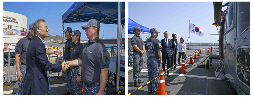 김기주 주오만대사는 청해부대가 우리 국민의 안전과 선박의 자유항행 보호를 위한 임무를 훌륭히 수행하고, 국제사회에서 우리나라의 위상을 높이는 데 기여하고 있다고 평가하고, 부대원들의 노고를 치하하였습니다.